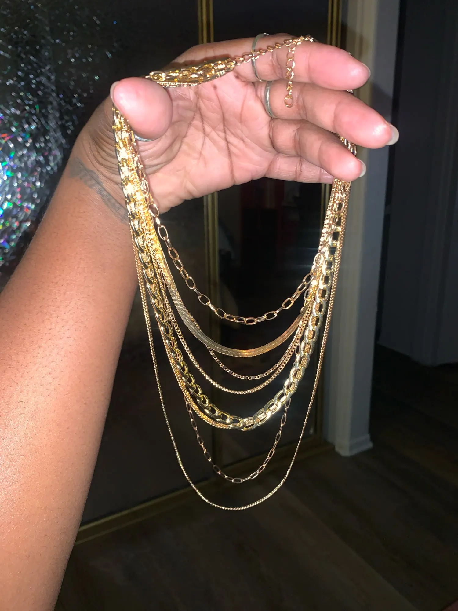 The Multi-Layer Necklace Set features a collection of gold-tone necklaces with trendy, boho-inspired designs. Each piece is adorned with delicate crystal pendants and can be worn together for a layered look or separately for a more straightforward style. This versatile set is perfect for adding a touch of elegance to any outfit and makes a beautiful gift for any occasion.