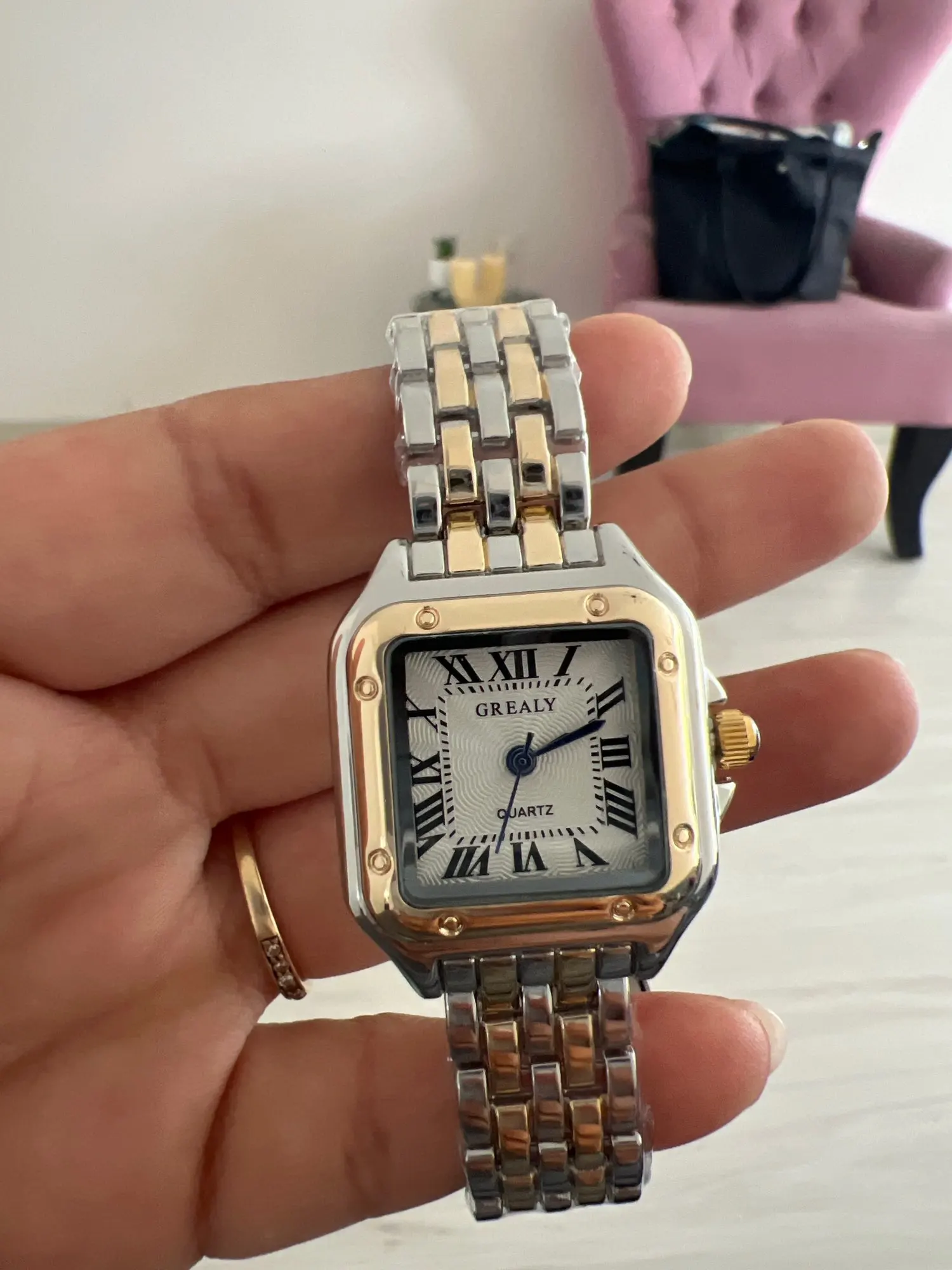 This watch captures the romance of vintage design while incorporating modern quartz reliability. The rectangular case and Roman numerals evoke the golden age of watchmaking, while the rhinestone details add contemporary sparkle. It's the perfect accessory for women who appreciate timeless style with a touch of luxury.